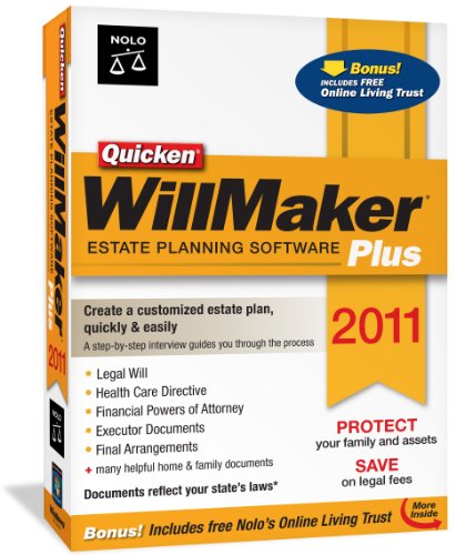 Make a legal will, health care directive and other documents that protect your family and property. Bonus! Includes free online living trust by Nolo. Plus: Register your software and download a free copy of Nolo's Encyclopedia of Everyday Law.Save your family money and time--create a customized estate plan quickly and easily with Quicken WillMaker Plus 2011. The software provides the forms, legal information and step-by-step guidance. All you have to do is follow a simple question and answer interview, make your wishes known, and in less than thirty minutes you can produce the following legal documents that protect your property and loved ones: Legal Will; Health Care Directive; Financial Powers of Attorney; Executor Documents; Information for Caregivers and Survivors; Revocation Documents; Final Arrangements.Quicken WillMaker Plus also provides dozens of personal finance and home and family documents that you can use to deal with common money matters and household situations. Forms include: Promissory Notes; Security Agreement for Borrowing Money; General Bill of Sale; Authorization for Foreign Travel With Minor; Housesitting and Childcare Instructions; Pet Care Agreement.Find help along the way! If you get stuck while completing a document, the onscreen guide and legal manual are right at your side. They help you understand the current task and provide legal and practical answers to questions that arise as you complete your documents. Need to make changes later? No problem! You can revise your answers at any time.Quicken WillMaker is written and updated regularly by Nolo's expert attorneys. Free legal updates will keep your program current through 2011. Choose Quicken WillMaker Plus and enjoy the peace and satisfaction of putting a solid estate plan into place.*Quicken WillMaker Plus is not valid in Louisiana or the U.S. Territories.